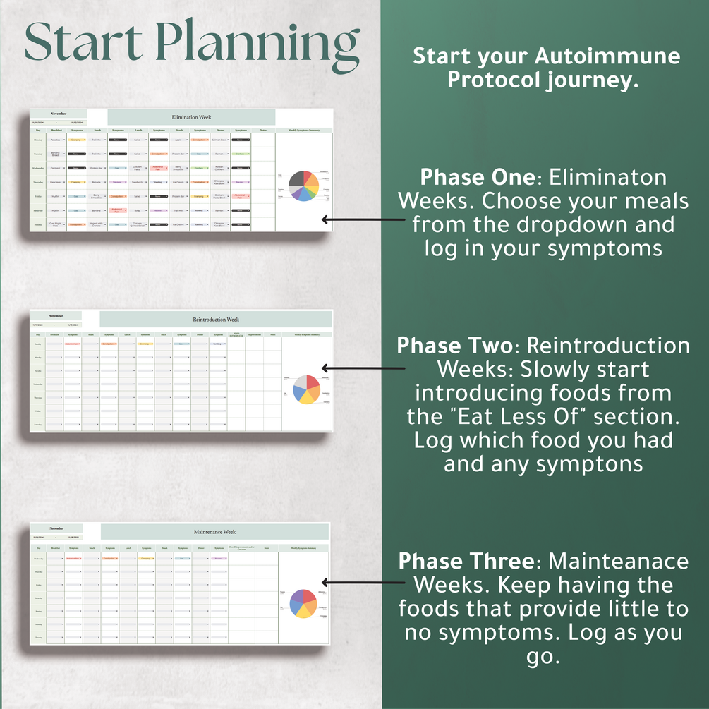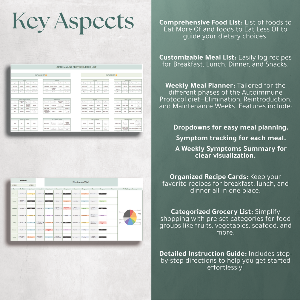 Take control of your health with the Autoimmune Protocol Meal Planner spreadsheet. Designed for those following the Autoimmune Protocol (AIP), this user-friendly spreadsheet helps you navigate each phase of the diet while keeping everything organized to reach your nutrition goals.