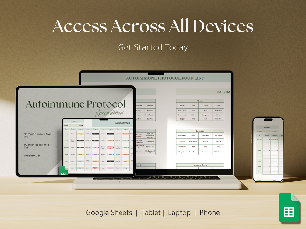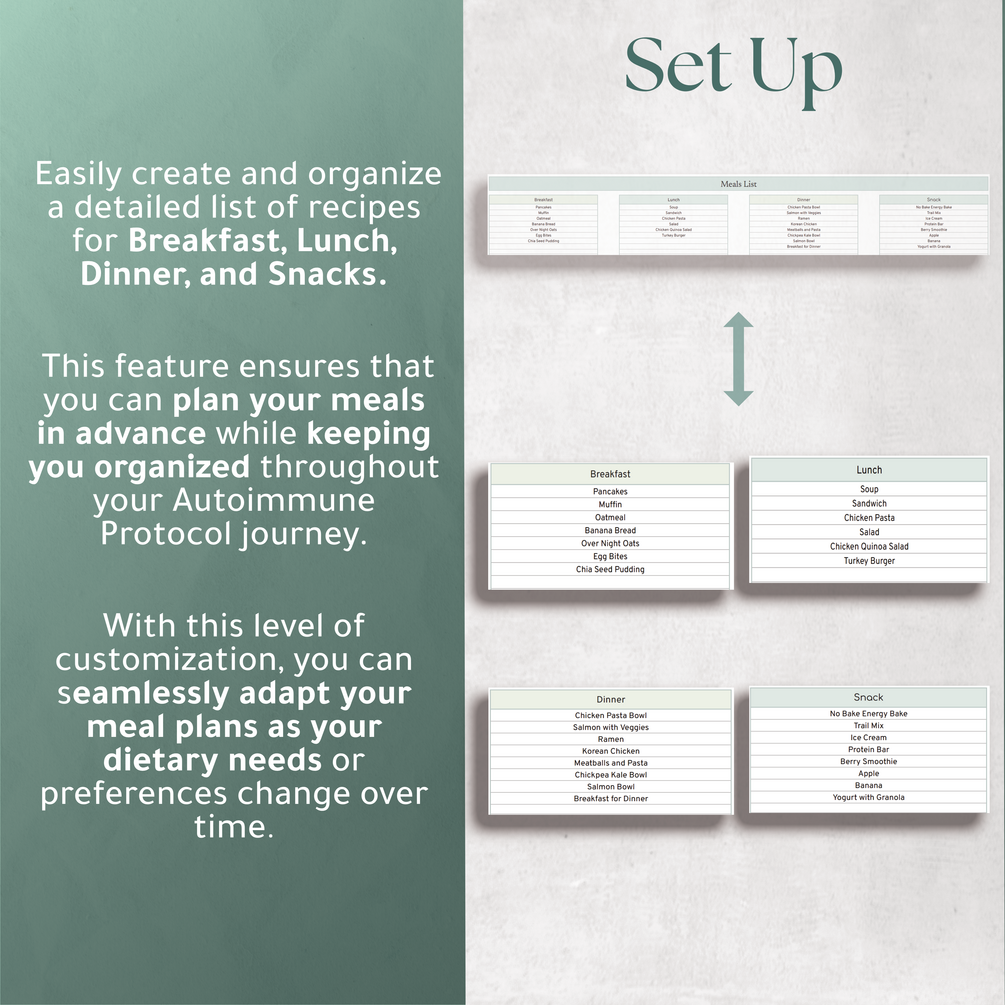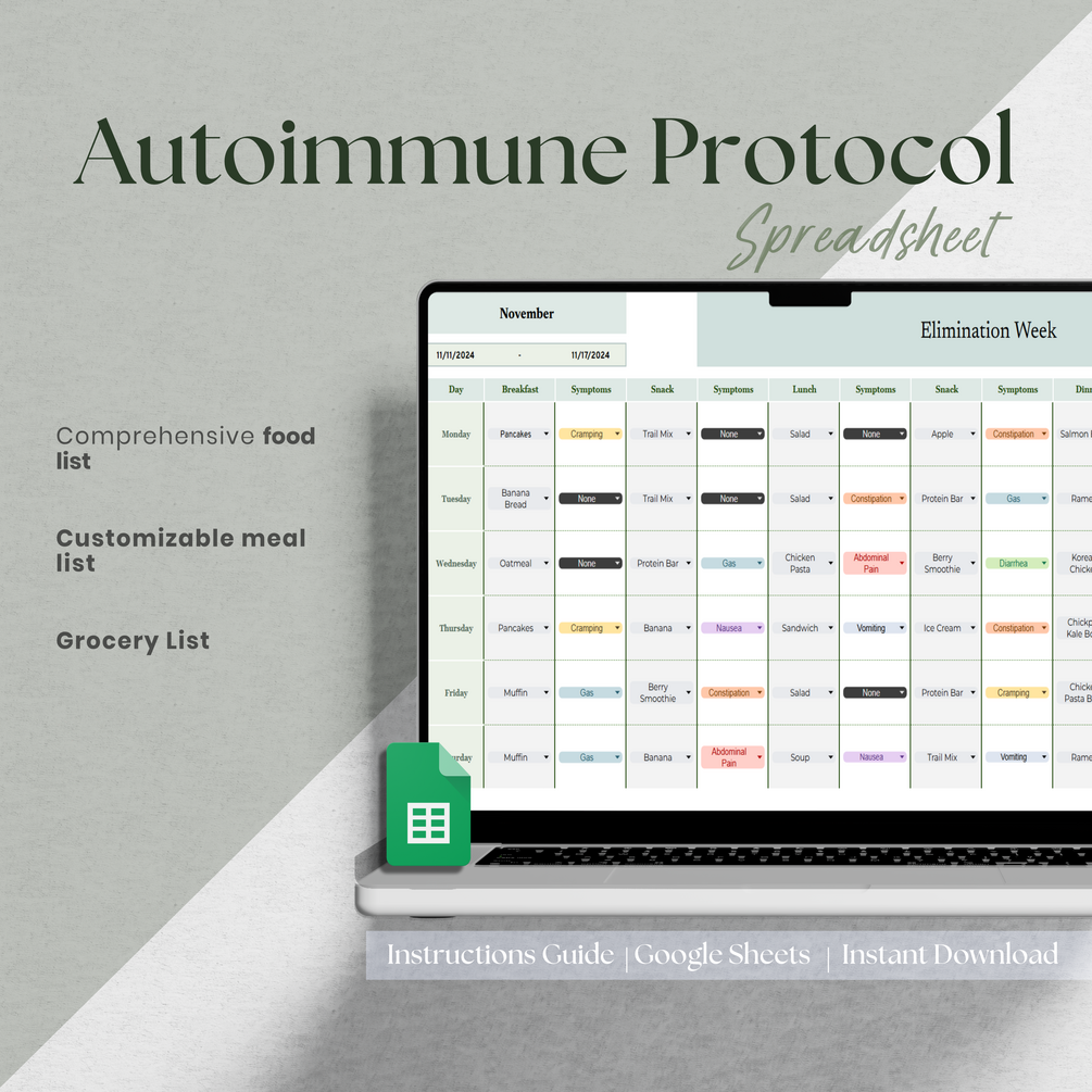 Autoimmune Protocol Diet Food List and Meal Planner| Diet and Food Tracker with Nutrition Guide| AIP Diet Planner Google Sheet Spreadsheet