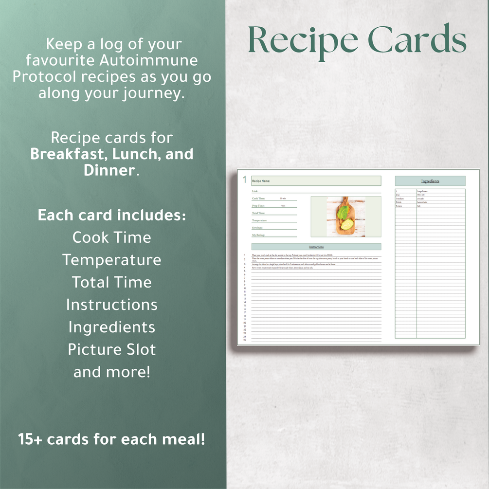 -Weekly Meal Planner: Tailored for the different phases of the Autoimmune Protocol diet—Elimination, Reintroduction, and Maintenance Weeks. Features include: